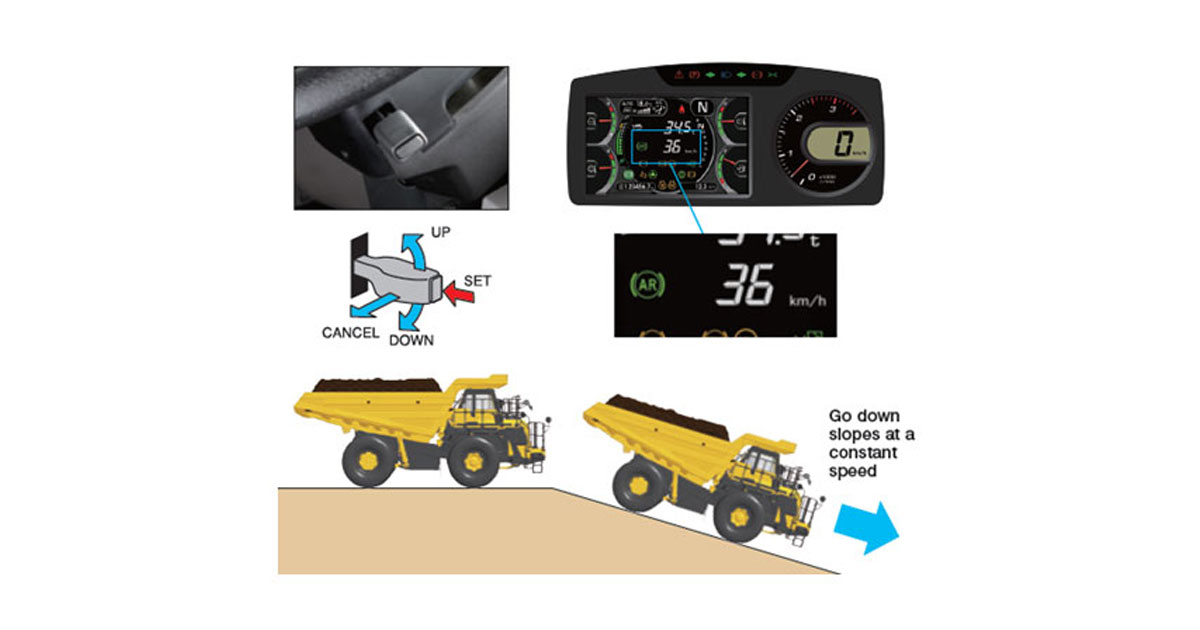 Auto Retard Speed Control (ARSC) allows to easily set a constant downhill travel speed and lets the operator concentrate on steering. Speed can be adjusted appropriately to the slope grade at an increment of 1 km/h by clicking the control lever (± 5 km/h max.)