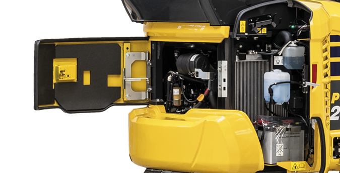 The wide opening engine bonnets provide a quick access to daily inspection points. Newly designed fully opening engine door and side cover provide a quick access to daily inspection points. For major maintenance and tasks, the front side cover is easily removable with access direct from ground level.