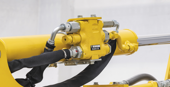The machine features dedicated hose burst valves on boom and arm cylinders.