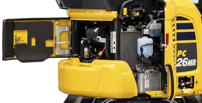 For increased jobsite safety, the PC26MR-5 includes a dual lock lever neutral detection system for travel and work equipment levers, along with a seat belt caution indicator and a secondary engine shutdown switch.