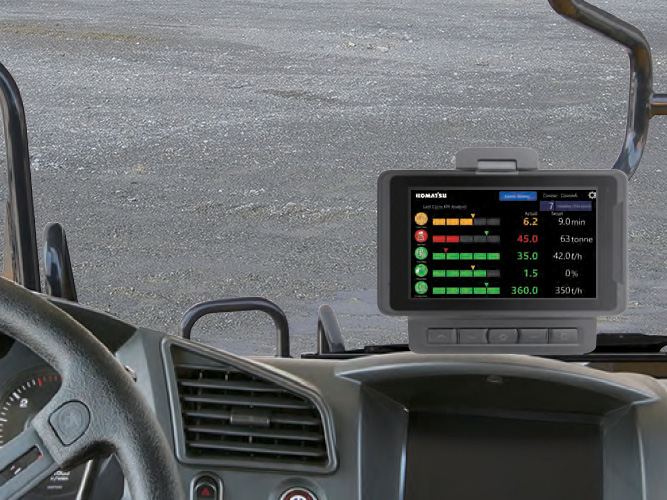 The operator guidance monitor improves operation efficiency with Key Performance Indicator (KPI) targets that help operators raise and refine their skills, resulting in higher fuel savings and productivity, and increased safety on the jobsite.