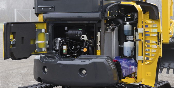 La grande ouverture des capots moteurs permet un accès rapide aux points d’inspection quotidien. La cabine facilement basculable vers l’avant autorise l’accès à tous les principaux composants hydrauliques pour les tâches de maintenance.