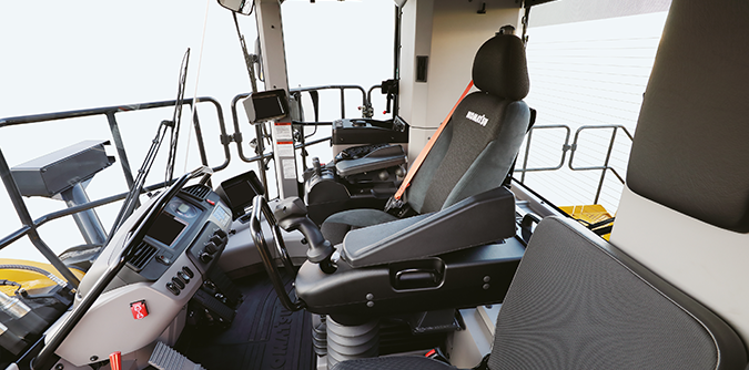 Le nouveau siège réglable avec suspension pneumatique, chauffé et ventilé est équipé de supports ajustables et de leviers de pilotage électronique standard pour un contrôle plus facile sur chaque chantier. L'écran TFT couleur et les nouveaux outils et fonctions s’inscrivent eux aussi dans cette démarche. Un nouveau siège escamotable permet au formateur de s’installer dans la cabine. Pour les conducteurs moins expérimentés, le système d’excavation automatique, l’approche semi-automatique et le déversement semi-automatique contribuent à des prestations homogènes.